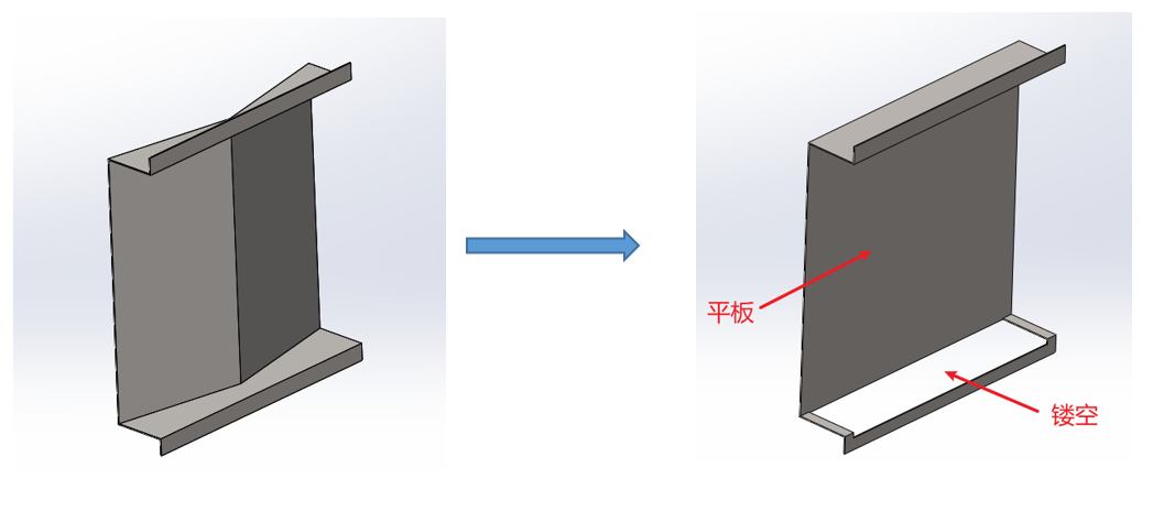 根據第二節提出的改進方向,結合現場實際加工需求,提出如下改進措施:1、去掉圖3.1(a)中兩側的擾流板;2、將入口處擾流板改為矩形,并將下方支撐板開孔,總體長寬高尺寸保持不變,如圖3.1(b)所示。